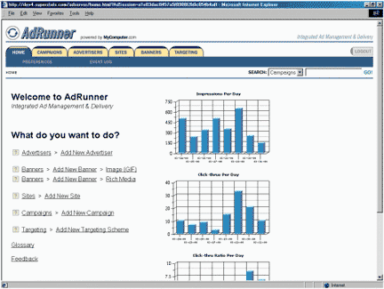 Web Interface continued. AdRunner Home The AdRunner Home tab serves as both the launching pad and the hub for common tasks associated with ad management and delivery. The homepage provides users a snapshot of a their account activity as well as additional resources, including a glossary and a section on advertising industry information. As the navigational hub, the AdRunner Home also provides quick links to common tasks and a robust, custom search tool.